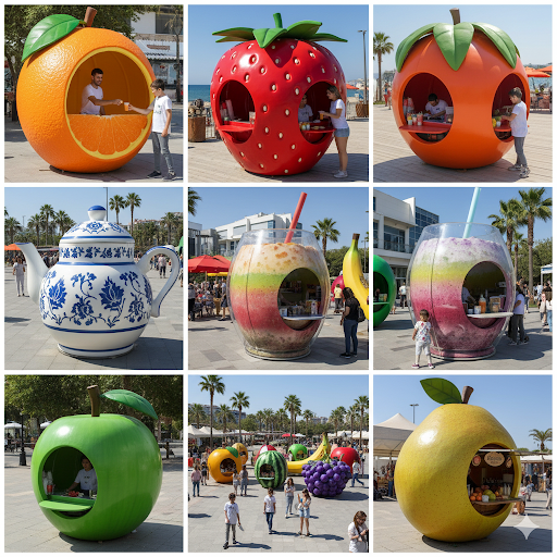 - Yiyecek ve İçecek Satış Büfeleri: Bu sektör, fiberglasın yaratıcılık potansiyelini en iyi kullanan alanlardan biridir. Sıradan bir içecek standı yerine, dev bir demlik şeklinde büfe veya şık bir bardak büfe ile satışlarınızda fark yaratabilirsiniz. Özellikle meyve suyu, taze sıkılmış meyve suları veya dondurma satan işletmeler için meyve şeklinde satış büfeleri tam anlamıyla birer mıknatıs gibidir. Dev bir portakal büfe veya sevimli bir çilek büfe, yoldan geçen herkesin dikkatini çeker ve özellikle çocukların ilgisini hemen toplar. Bu yaratıcı yaklaşımla, basit bir satış noktasını, markanın maskotu haline getirebilirsiniz. Elma büfe veya armut büfe gibi her türlü meyve formuna bürünebilen bu satış noktaları, ürünlerinizin tazeliğini ve doğallığını sembolize eder.